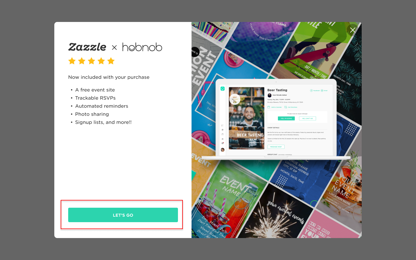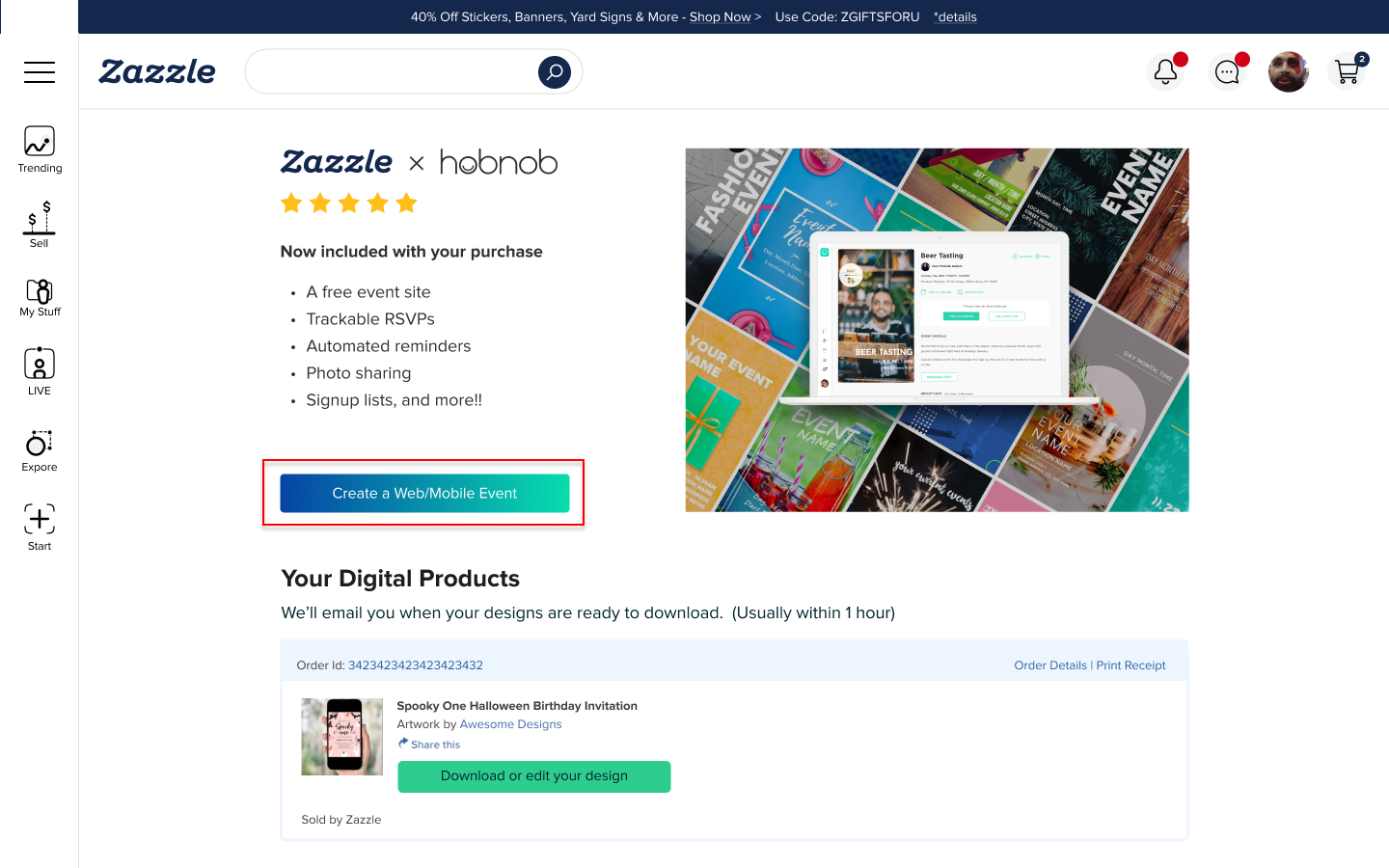 After your purchase is complete, Zazzle will show you an option to create a free event site powered by Hobnob.