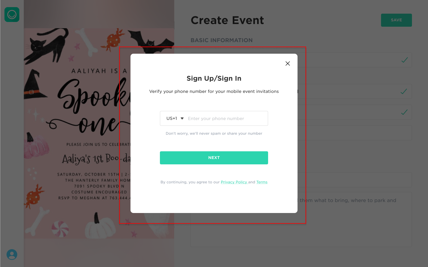 A: Make sure you log in using the same phone number you confirmed on the web. If you don’t see your event right away, check the Drafts tab.