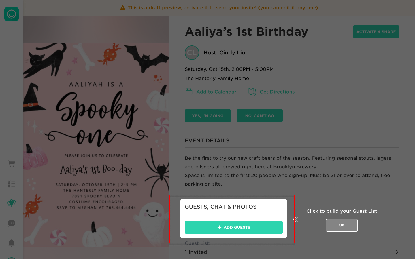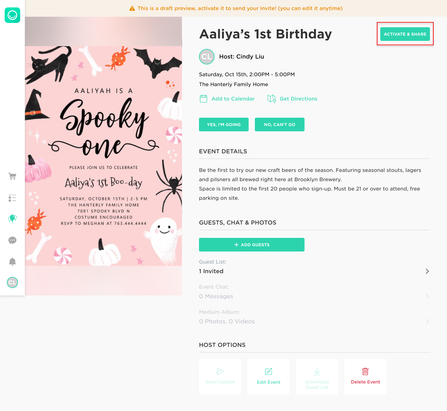 - Tap Activate & Share to finalize your event and start inviting guests.
